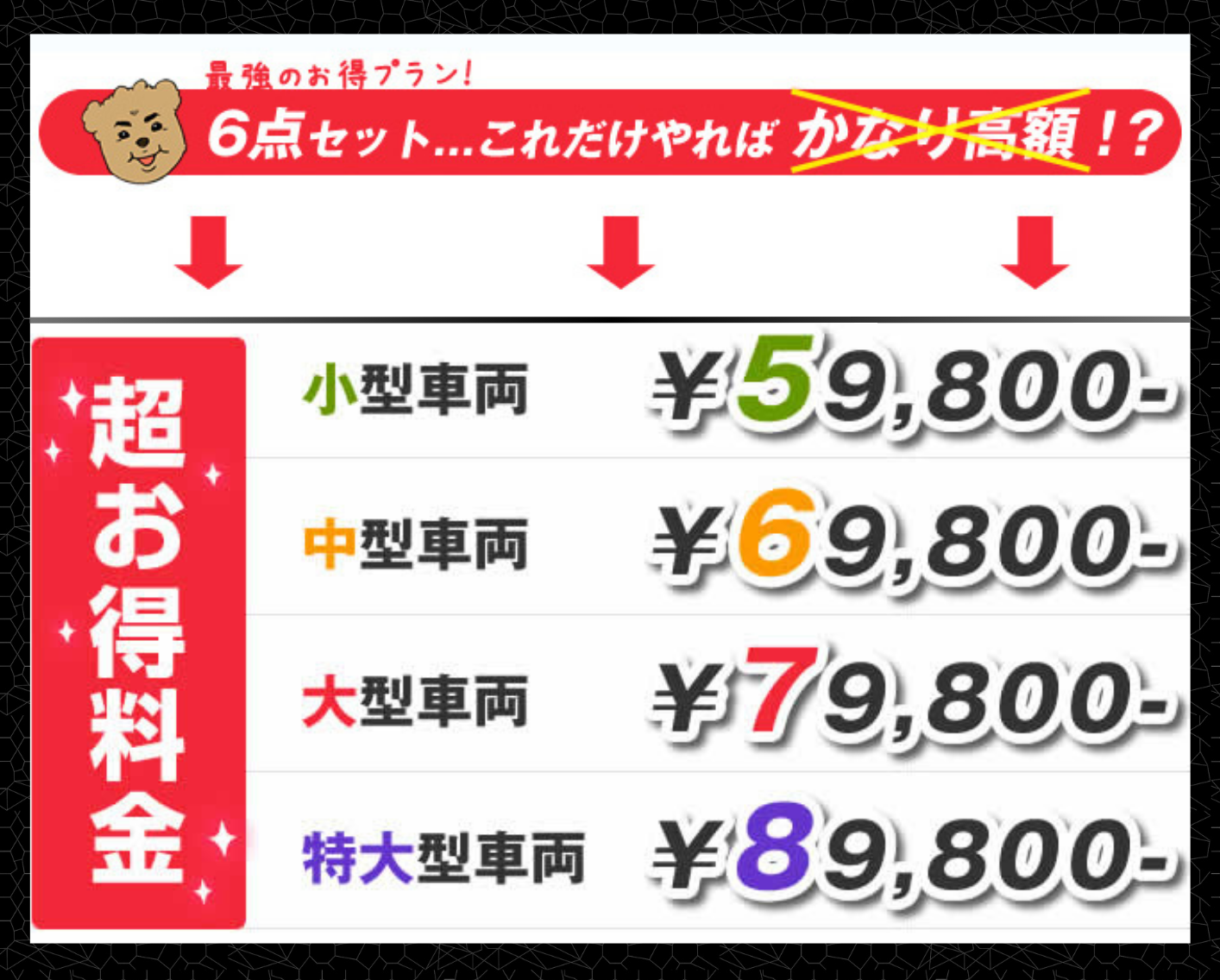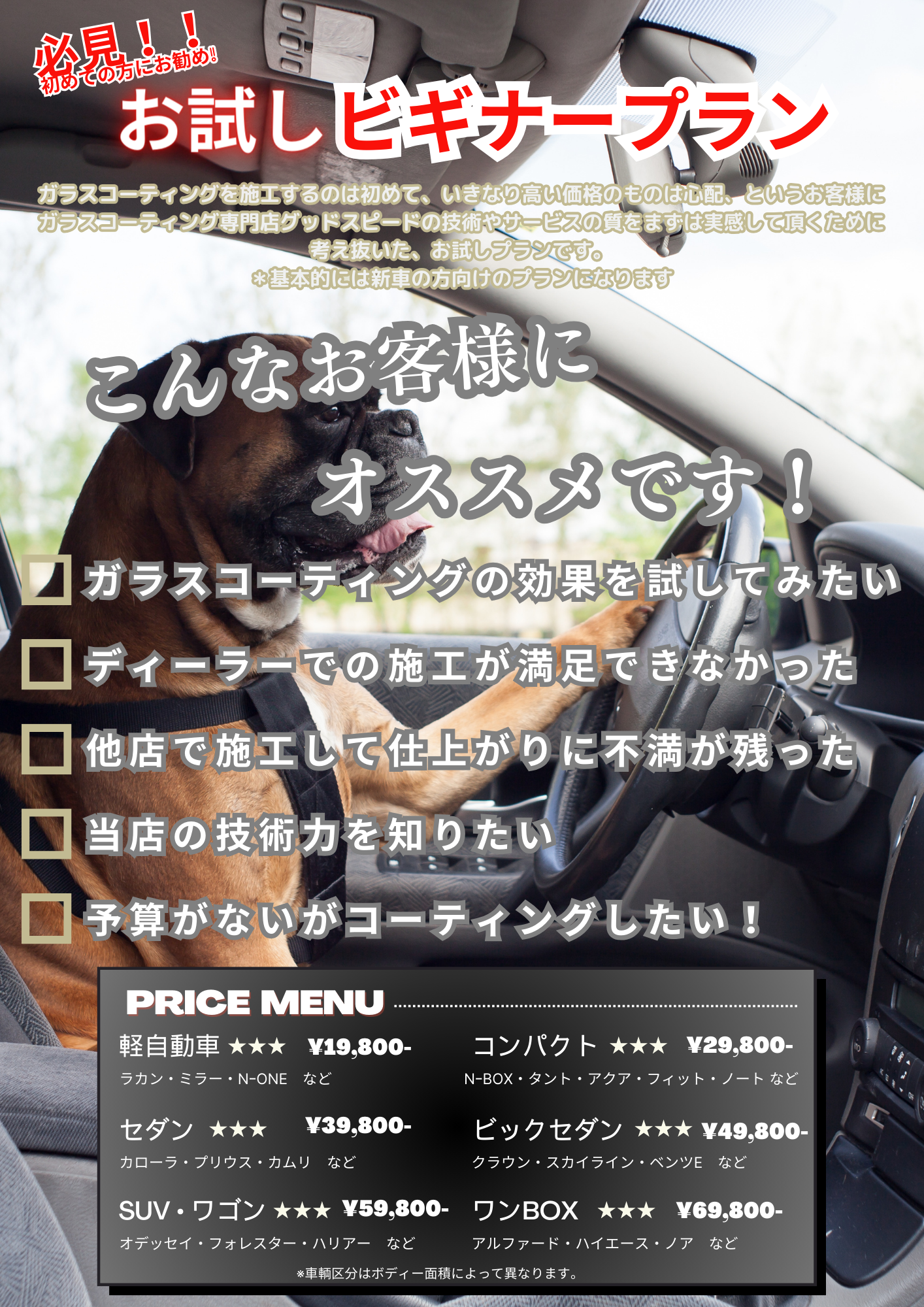 例えば年間施工台数1000台以上!なんて施工店の広告もよく見ます。という事は大凡毎月83台 営業日数が25日だとすると1日に3.3台仕上げる必要がありますよね?そのお店の規模、スタッフ数、作業時間を考えただけでも 嘘デタラメだらけで無理がありますよね! 我々プロからするとお店の写真を見ただけでその環境ではしっかりした作業は絶対出来ないと断言できるお店が殆どです。騙されないで下さい!