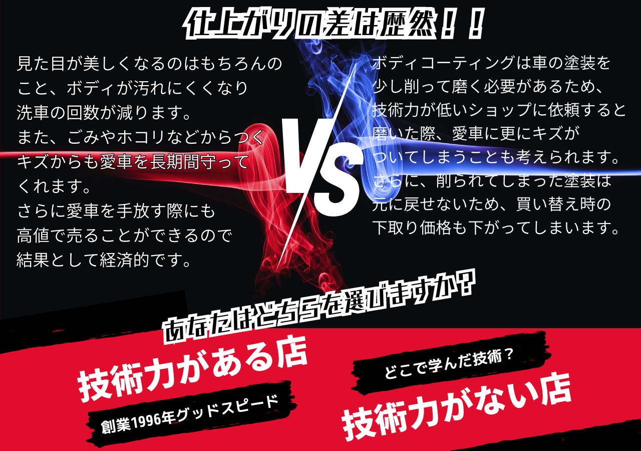 質問① 沢山の施工店がある中、当店を選ばれた理由をお聞かせください。 コーティングの理由、内容に納得性があったので、グッドスピードさんを選びました。 質問② 当店をご利用頂いたご感想をお聞かせください。 私の希望ニーズに合わせてくれるの...